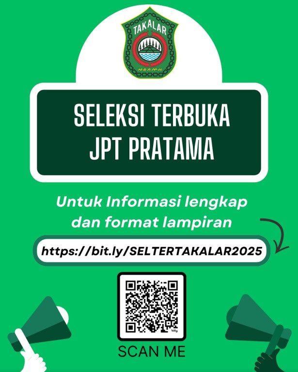Pemerintah Kabupaten Takalar melalui Panitia Seleksi Jabatan Pimpinan Tinggi (JPT) Pratama resmi membuka Seleksi Terbuka Pengisian Jabatan Pimpinan Tinggi Pratama Tahun 2025 pada tanggal 08 Desember s.d. 22 Desember 2025.