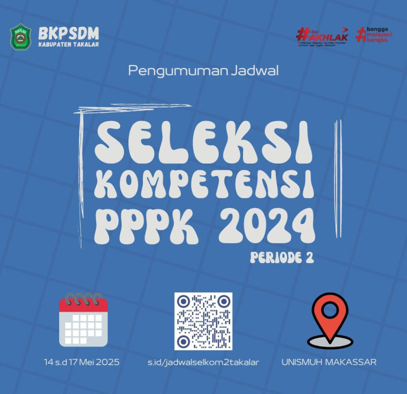 Pengumuman jadwal Seleksi Kompetensi PPPK Pemerintah Kabupaten Takalar Tahun Anggaran 2024 Periode II. Informasi selengkapnya dapat dilihat pada link s.id/jadwalselkom2takalar