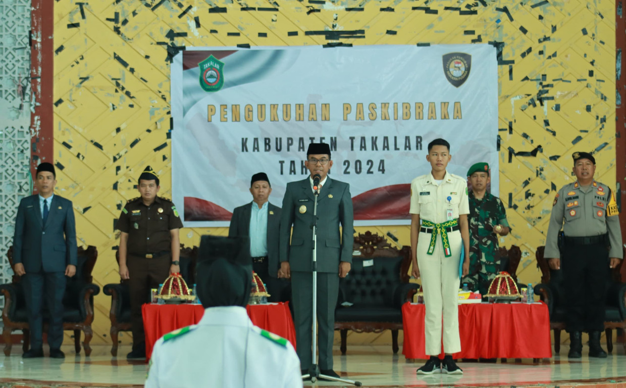 Pj. Bupati Takalar Dr. Setiawan Aswad,.M.Dev,.Plg resmi mengukuhkan 76 putra putri terbaik Kab. Takalar sebagai anggota Pasukan Pengibar Bendera Pusaka (Paskibraka) Tingkat Kab. Takalar Tahun 2024 di Gedung Islamic Center Kab. Takalar, Jum'at 16 Agustus 2024.