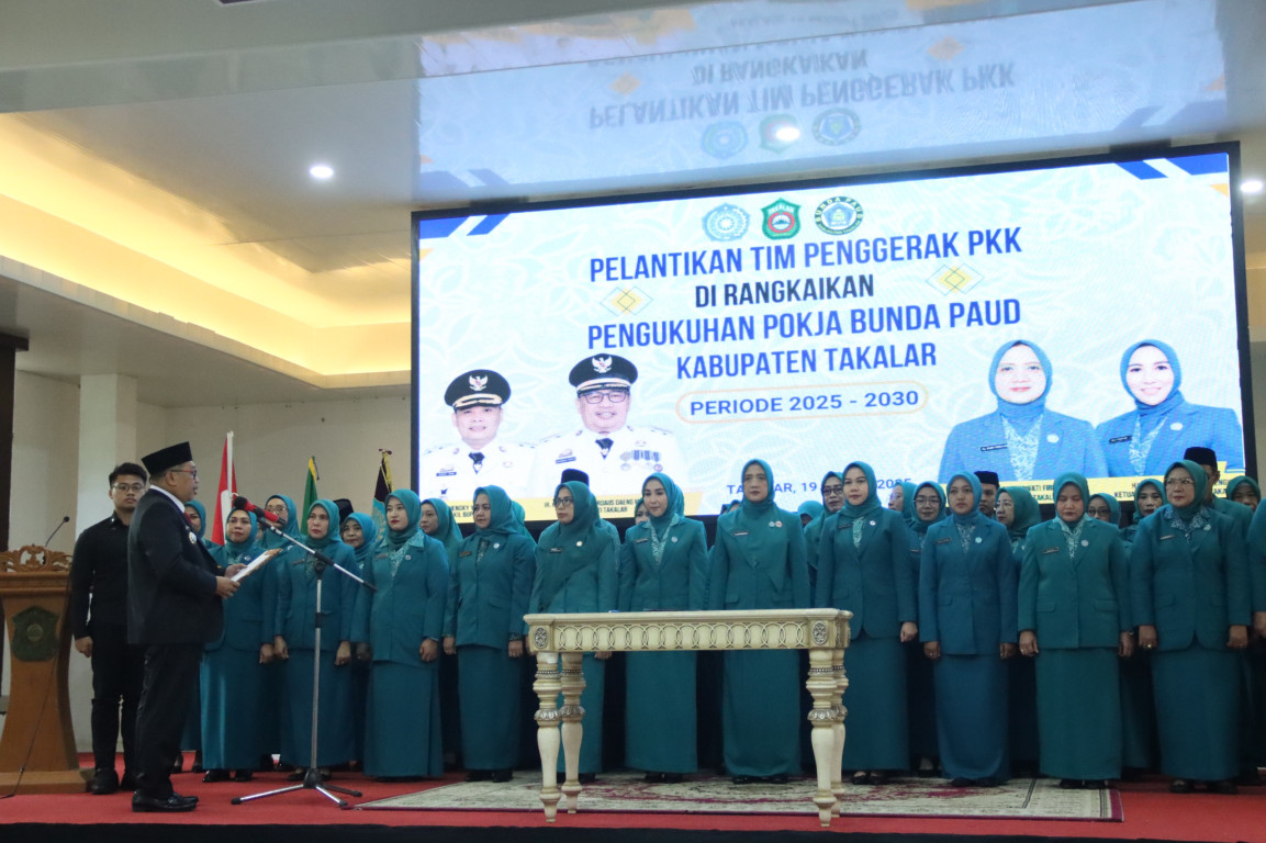Proses pelantikan Pengurus PKK Kab. Takalar Masa Bakti 2025-2030 dirangkaian dengan Pengukuhan Pokja Bunda PAUD Kab. Takalar berlangsung di Ruang Pola Kantor Bupati Takalar.