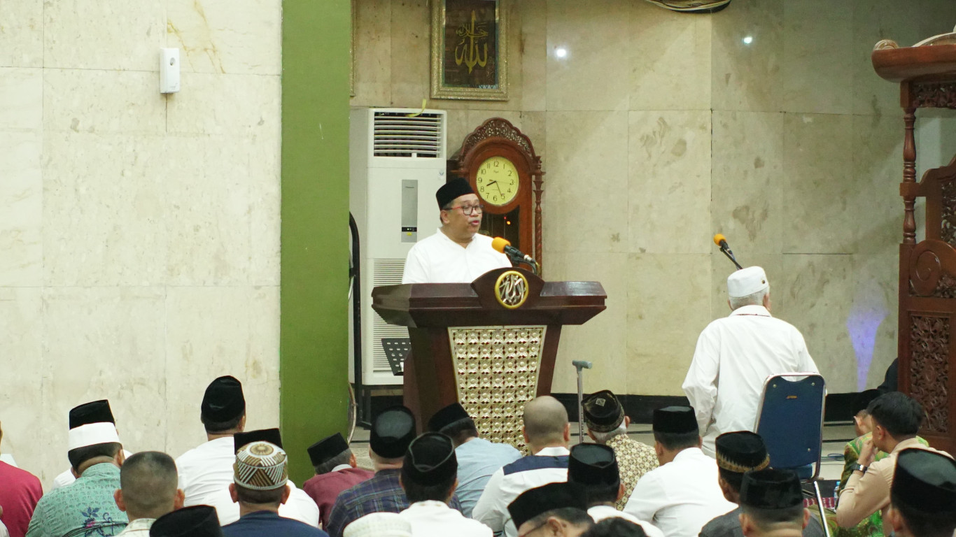Bupati Takalar Ir. H Mohammad Firdaus, MM Daeng Manye bersama Wakil Bupati Takalar Dr. H. Hengky Yasin, S.Sos., M.M., melaksanakan Shalat Tarwih perdana bersama masyarakat Takalar di Masjid Agung Takalar pada Senin (3/3/2025) malam.