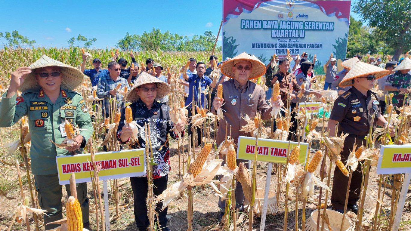 Wakil Bupati Takalar Dr. H. Hengky Yasin,.S.Sos,.MM bersama dua Jendral Bintang Dua yaitu Irjen Rusdi Hartono Kapolda Sulsel dan Mayjen TNI Windiyatno Pangdam XIV Hasanuddin ikut melakukan Panen Raya Jagung serentak se-Indonesia, Kamis (5/6/2025).