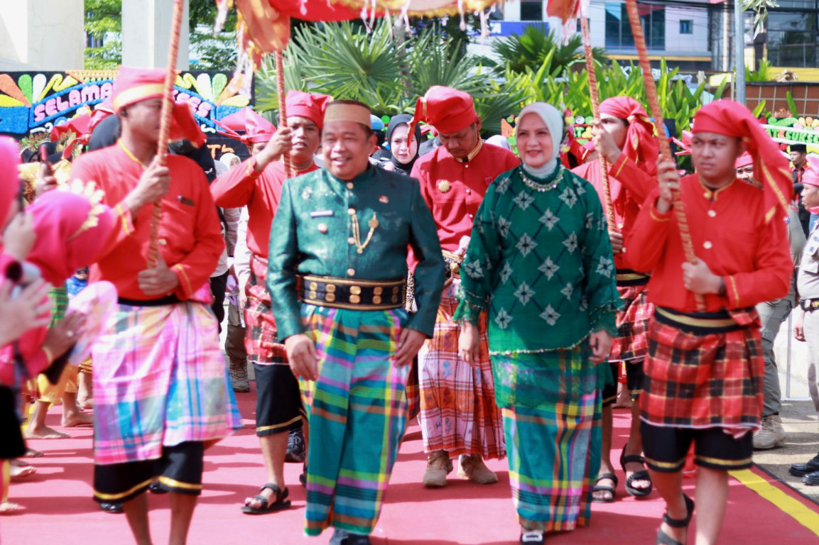 Bupati Takalar Ir. H. Mohammad Firdaus Daeng Manye,. MM bersama Ketua TP. PKK Kab. Takalar Dewi Sriekowati Firdaus menghadiri Hari Ulang Tahun (HUT) Ke-705 Kabupaten Gowa di Kawasan Istana Balla Lompoa, Senin 17 November 2025.