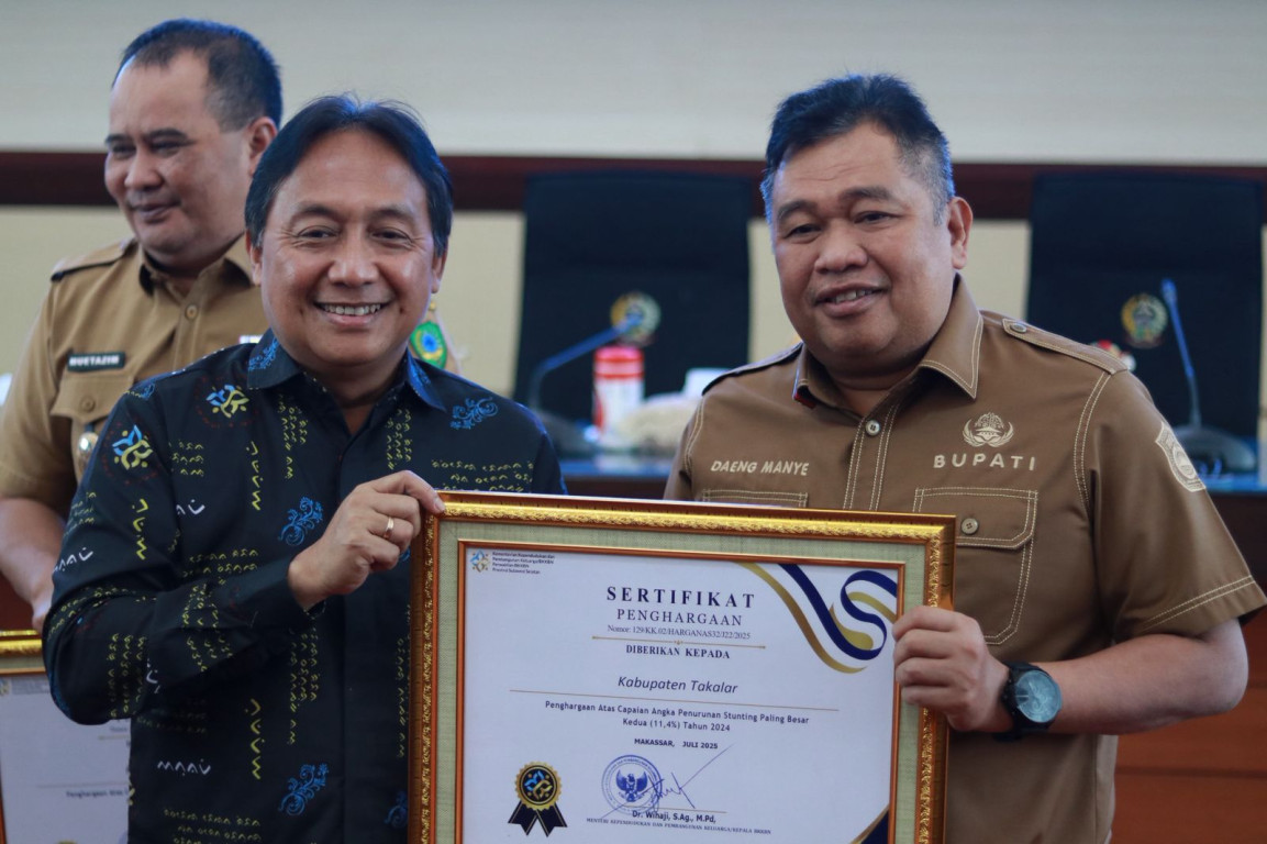 Pemerintah Kabupaten Takalar kembali meraih prestasi membanggakan dengan diraihnya Penghargaan Capaian Angka Penurunan Stunting Paling Besar Kedua Tahun 2024 di Sulawesi Selatan dari Menteri Kependudukan Dan Pembangunan Keluarga, Selasa 16 Desember 2025.